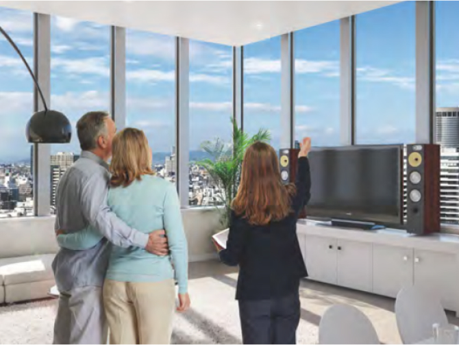 モデルルーム眺望投影システム「パノラビジョン」は、プロジェクションマッピングを使って、マンション各階層の眺望を、モデルルームで体験できるサービスです。